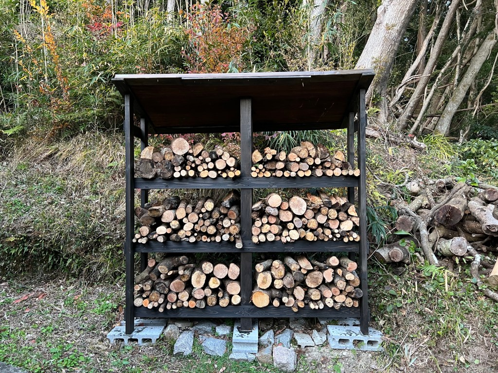 ほぼカラだった薪棚が一杯に。