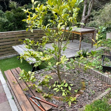 3年ほど前に植えたレモンの木。まだ、なかなか実が付かないのですが、今日、枝同士が密集し陽が入らなくなっている部分を剪定。 また、肥料(物置にあった牛糞)を与えました。 今年こそは!