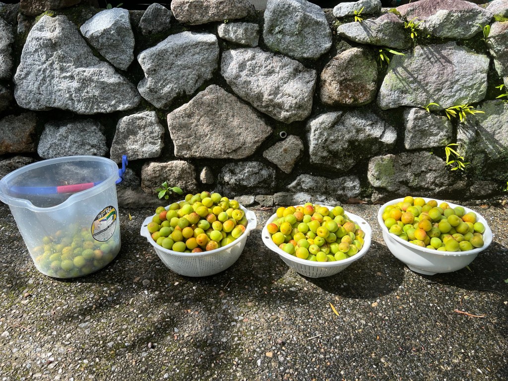 家の前の梅、どんどん落ちて道路に転がっていくので、収穫しました。裏庭の梅の方が粒が大きく質がいいので、そちらはもう少し待って梅干しにします。