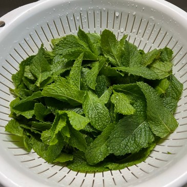 庭のミント、伸び放題。 長く伸び過ぎたものをバッサリ切って、上部の良い葉っぱだけを洗って。 ミントティを楽しみます。お湯を注ぐだけです。