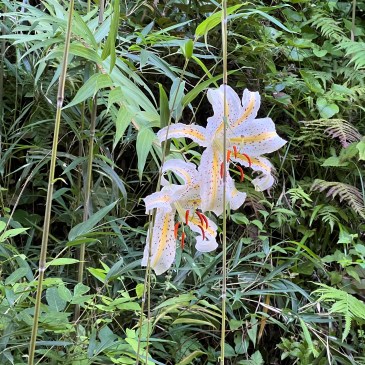 この時期、家の周りでヤマユリが咲きます。 台所の窓からも格子越しですが、目の前に見えて気分が上がります。