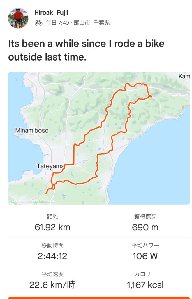 総距離62km。朝8時に出発して11時には帰宅。南房総を縦横無尽に走り回り最高の気分。