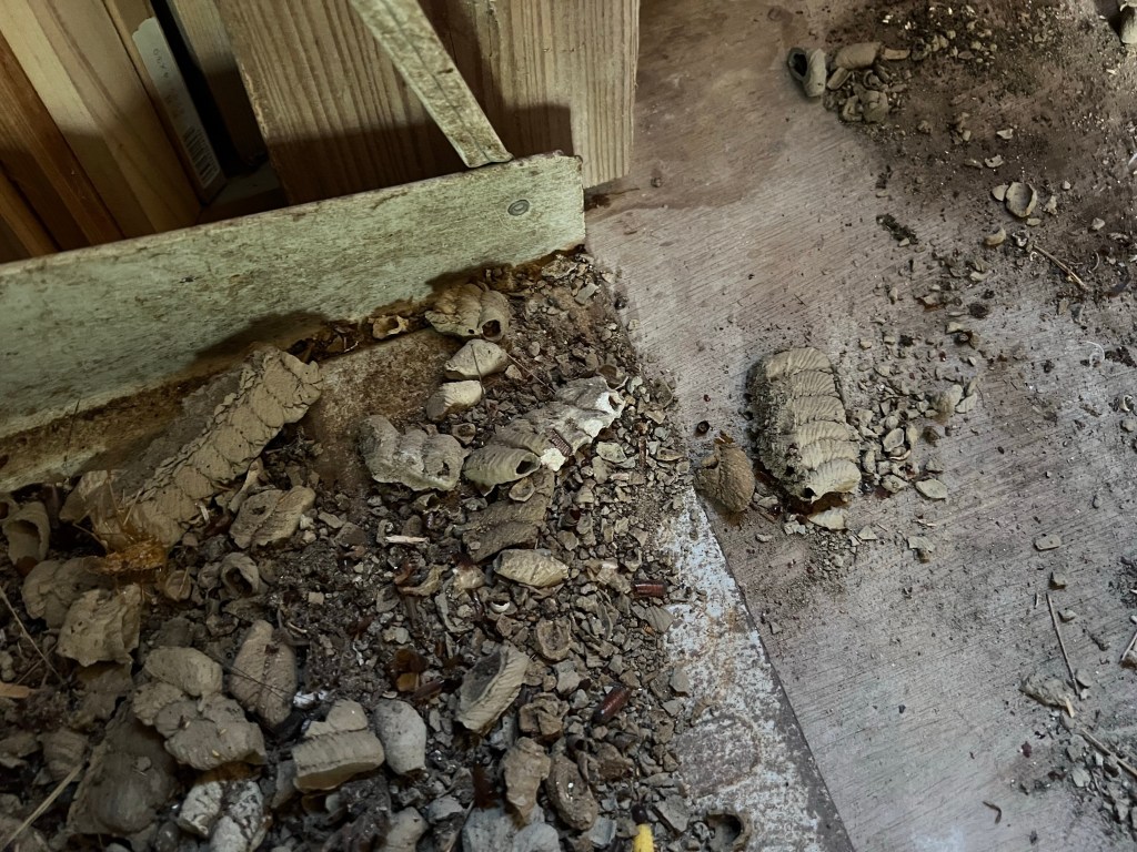 この物置き、どこからかジガバチが入り込んで色々なものの隙間に土製の巣を作っていて、その駆除に先ずは一苦労。