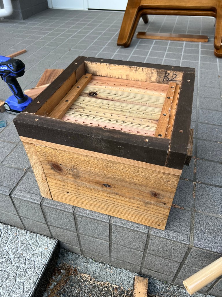 蜜蜂の巣が四段箱の下まで来ているのでそろそろ一番上の段の分の蜜を頂こうかと思っているのですが、この養蜂箱にはトップにアカリンダニ対策のハッカを入れるスノコの箱が無く、採蜜の作業時に載せるため、自分で作ることに。