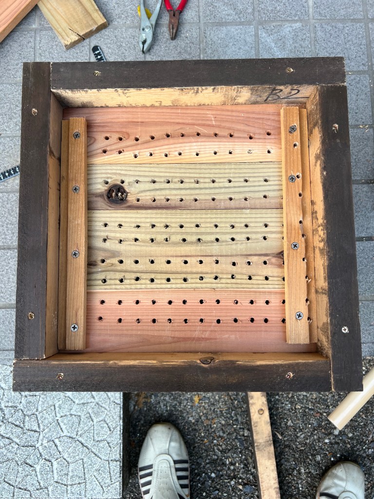 通常はスノコ状に隙間を開けるのですが、5mmのドリルで穴を開けました。忌避剤の成分がこの穴を抜けて下に落ちていきます。