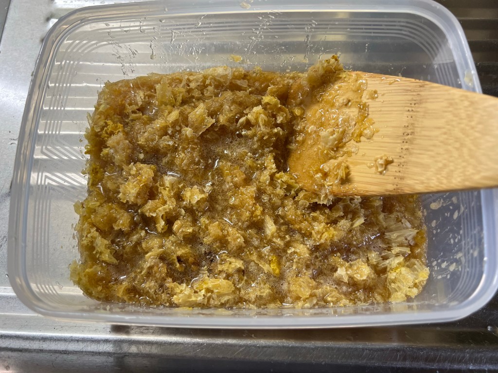 乾いてしまっている部分をなるべく削ぎ落として蜜の入っている部分をタッパーに集め、木べらで砕いていきます。