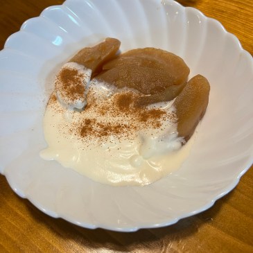 リンゴの皮を剥いて切ってそのまま鍋に入れて薪ストーブの上に載せておく。 生クリームに砂糖を少々加え泡立てて作ったホイップを添えて、シナモンパウダーを振りかけて出来上がり。 冬の最高のデザートです。