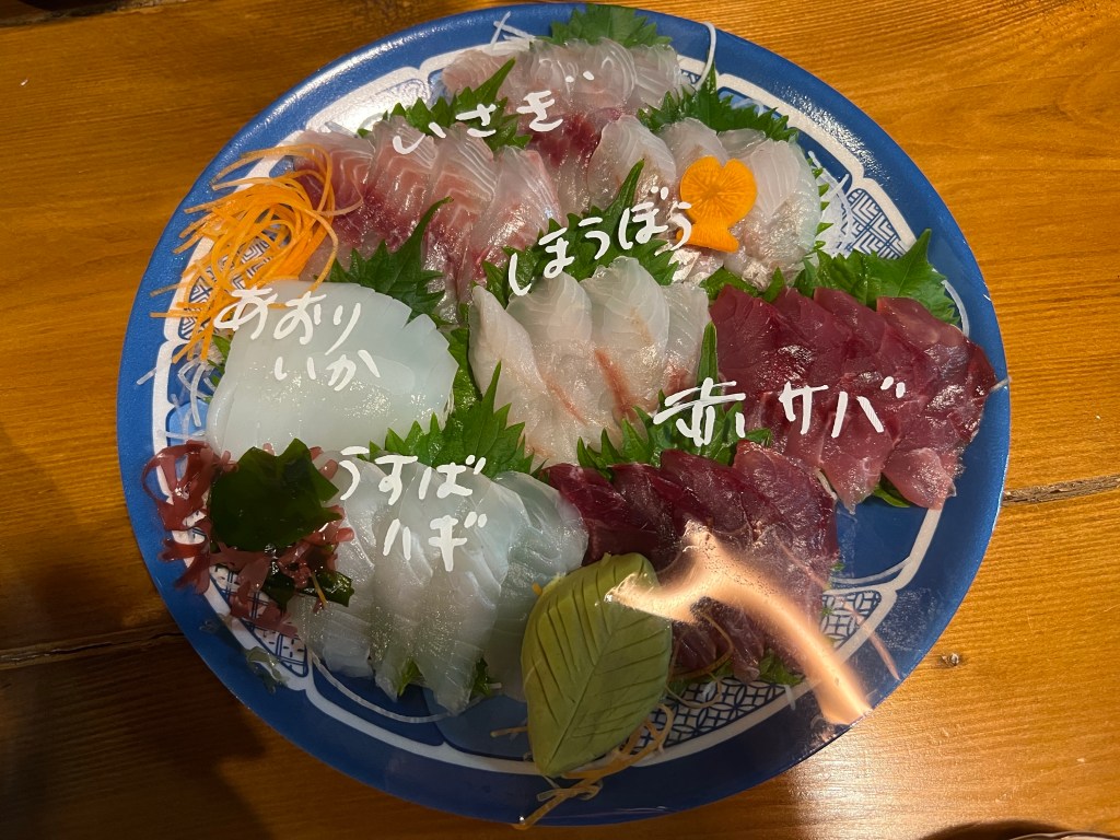 この地で上がってくる地魚のみ扱っているので、普段スーパーでは目にすることのない魚を楽しめます。かつ、スーパーに売っているお刺身と違い、しっとりしてて何故か美味しいのです。