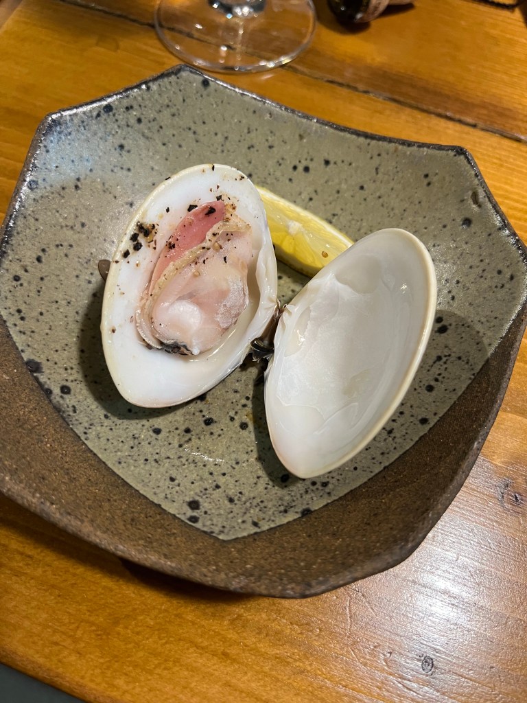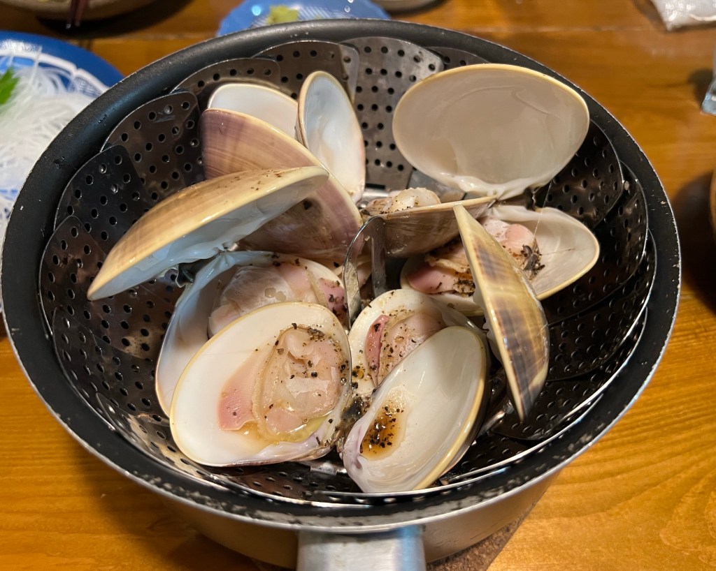 友人が来たので、最近、通っている鮮魚店「麻布館山」で地魚の刺身盛り合わせとハマグリを事前予約で購入。