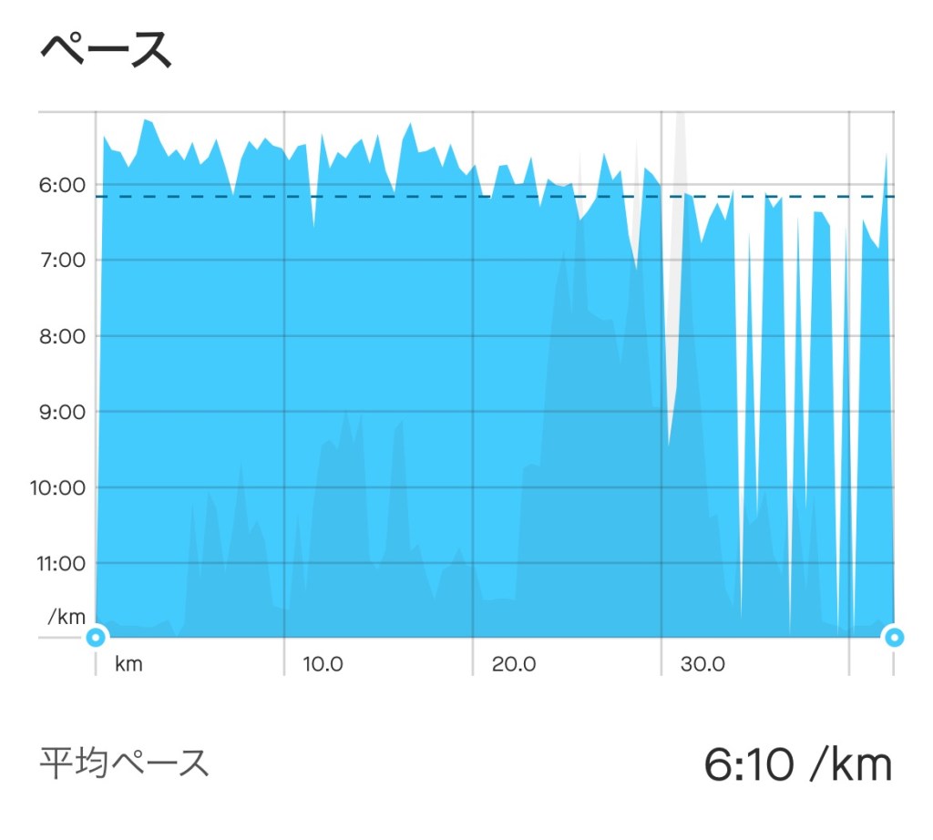 前半ハーフの折返しは2時間を切る良いペースでしたが、後半、脚が棒になり、上りもあり失速。