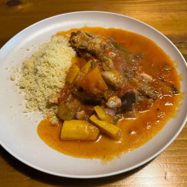 今日の夕食はクスクス。 ナス、ズッキーニ、ピーマン、ニンジン、タマネギ、鶏肉をホールトマト、ニンニク、コンソメ、クミンで煮込んで。 クスクスは一人50g。前回、一人100gで計算して作り過ぎたので。 野菜たっぷり、鶏肉の … 続きを読む : クスクス