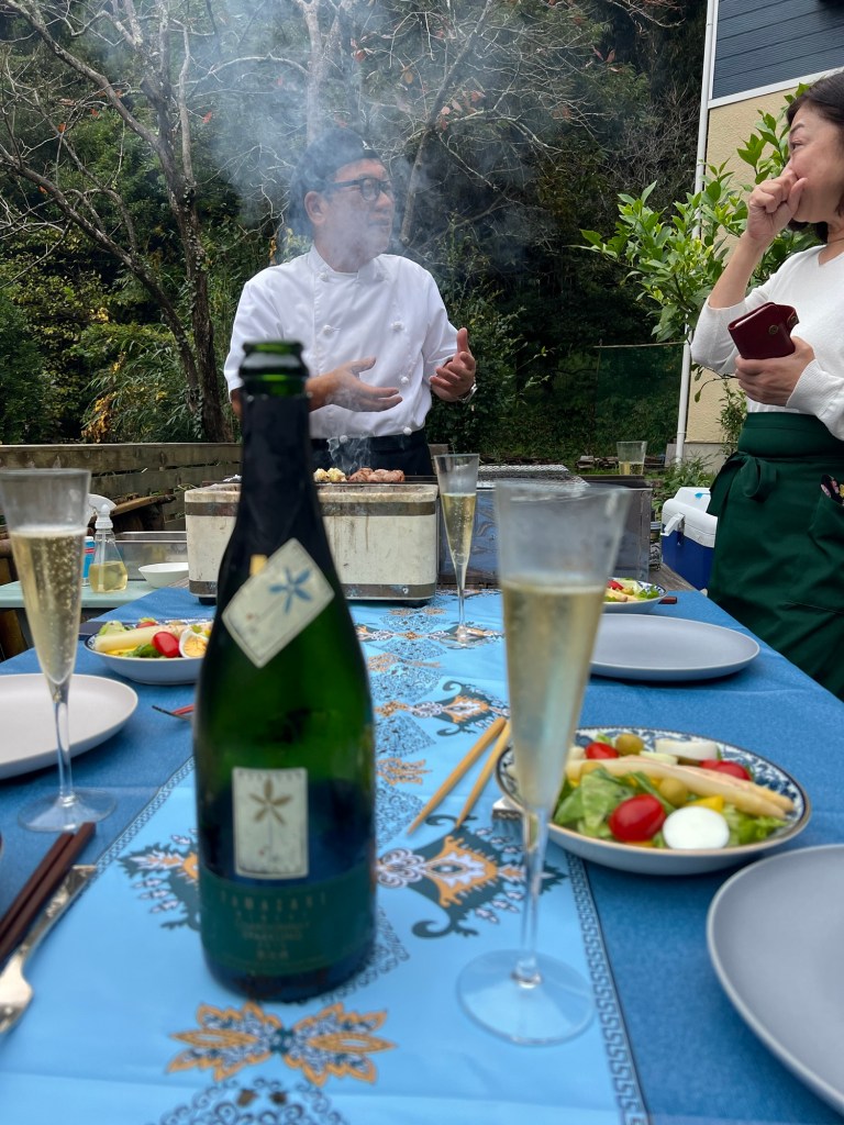 ワインは私が乾杯用に山﨑ワイナリーのシャルドネスパークリングと同じく山﨑ワイナリーの少しロゼっぽい白のピノブラッシュ。