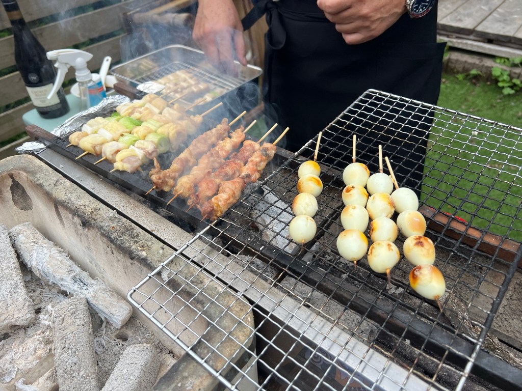 焼き鳥マスターは、前日の朝、川崎の市場で鶏を仕入れ、仕込んできたもの、プラス、途中、道の駅で新鮮野菜を仕入れ材料は完璧。焼き台も服装もプロ仕様で気合が入っています(笑)