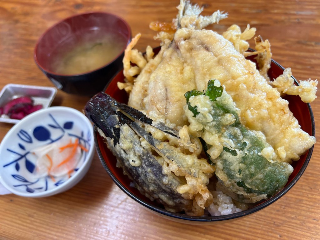 まずはお昼を食べに安房神社近くの「相浜亭」に混雑する前に着けるよう直行。ここは相浜漁港に面した海鮮料理の食堂で海鮮丼が1100円とコスパが高く、観光客も多く訪れる人気店です。今回自分はアジ天丼をオーダー。