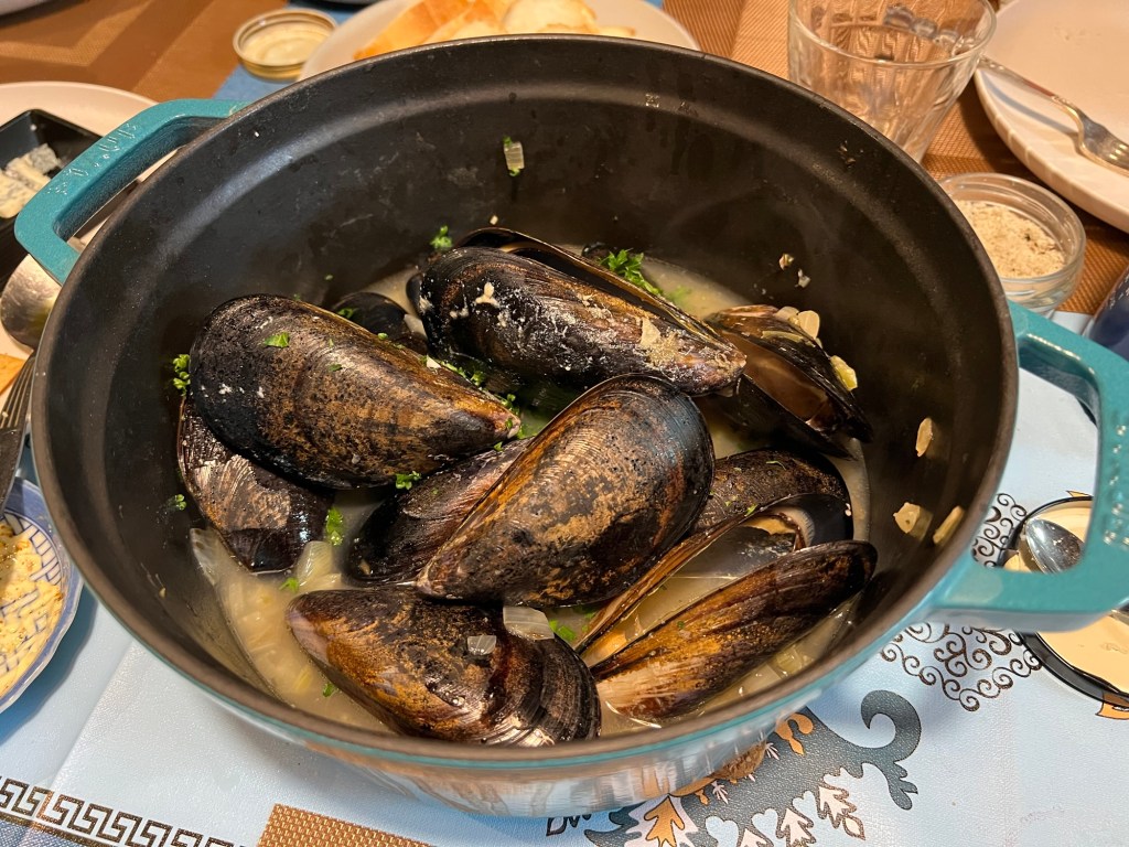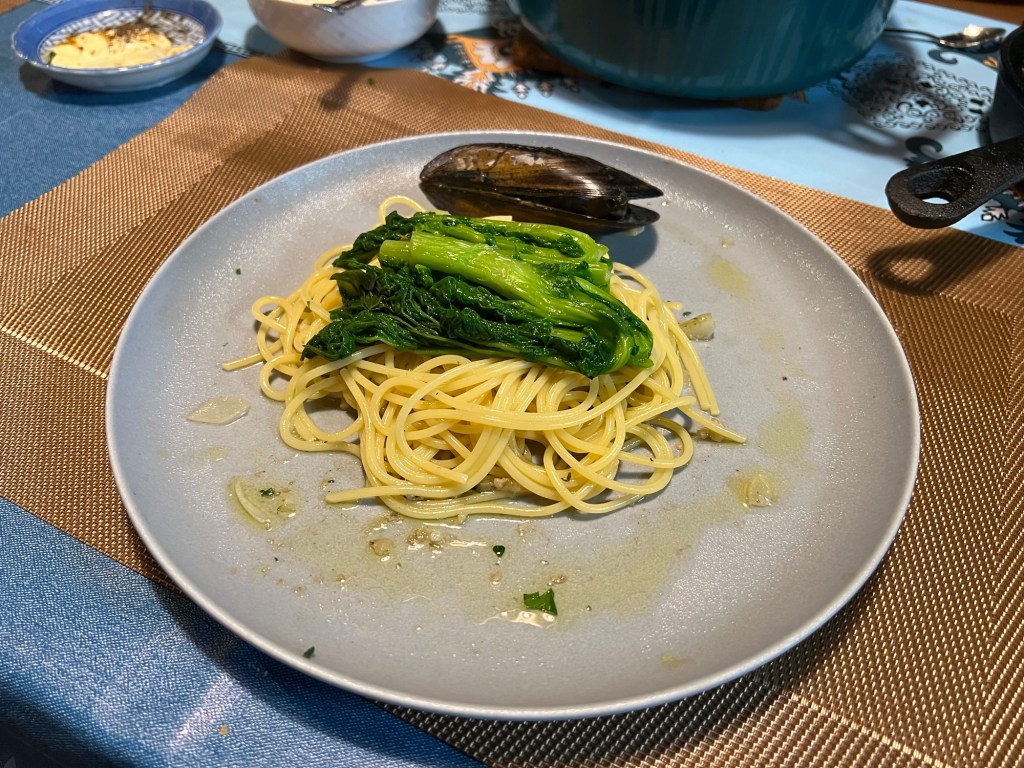 先週のワイン会の時に取り寄せ、冷凍保存していたムール貝を使ってワイン蒸しをしたり、その煮汁を使って道の駅で買った菜花を合わせてパスタを作ったり、薪ストーブでアヒージョを作ったり、料理づくりも楽しみながら、また、結構飲みました。
