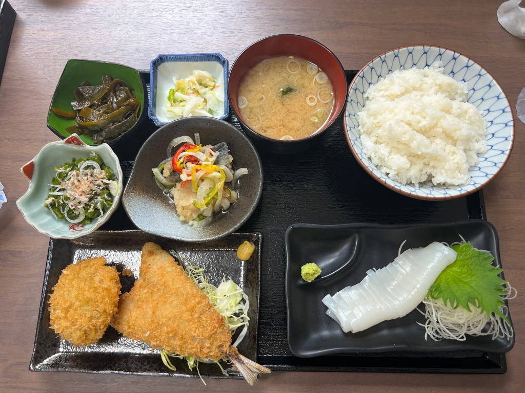 アジフライ、サバメンチかつ、茎わかめの炒め物、アジの南蛮漬け、スルメイカの刺身、めかぶにワカメのお味噌汁。