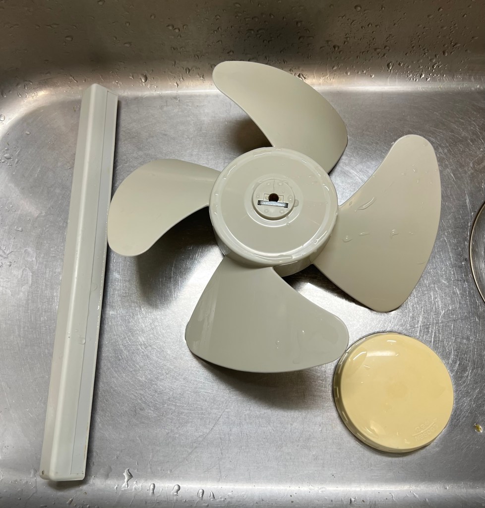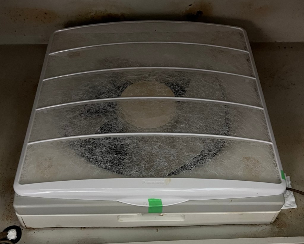 次に換気扇そのものの清掃。古いフィルターを取り除いて羽を取り外しマイペットでクリーニング。