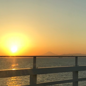 今日は「渚の駅 館山」屋上で夕陽を背景に気持ちの良い写真が撮れました。近くに自衛隊の基地があり、ヘリコプターが海上を旋回。手前には観光船。遠くには富士山。夕陽をどう撮るか、その組み合わせを楽しみました。